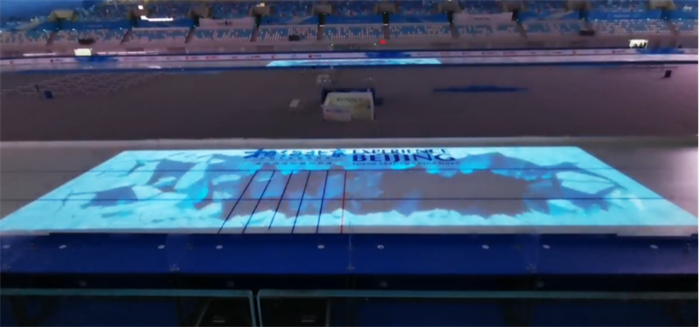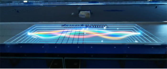 本次比賽中體育展示團(tuán)隊(duì)在視頻制作和賽場(chǎng)投影中高質(zhì)量完成了速滑測(cè)試賽總片頭、速滑屏幕主視覺(jué)、頒獎(jiǎng)儀式動(dòng)態(tài)畫(huà)面,以及裸眼3D視效呈現(xiàn)的冰面投影展示。數(shù)字內(nèi)容圍繞速度、熱情、動(dòng)感、冰雪、速滑館等中國(guó)元素,介紹賽事及運(yùn)動(dòng)員信息,展現(xiàn)速度滑冰及運(yùn)動(dòng)員的魅力,通過(guò)炫酷特效打造極具震撼的視覺(jué)沖擊力,激發(fā)觀眾對(duì)于后續(xù)比賽的期待和憧憬,在測(cè)試賽中更好地展示中國(guó)文化。