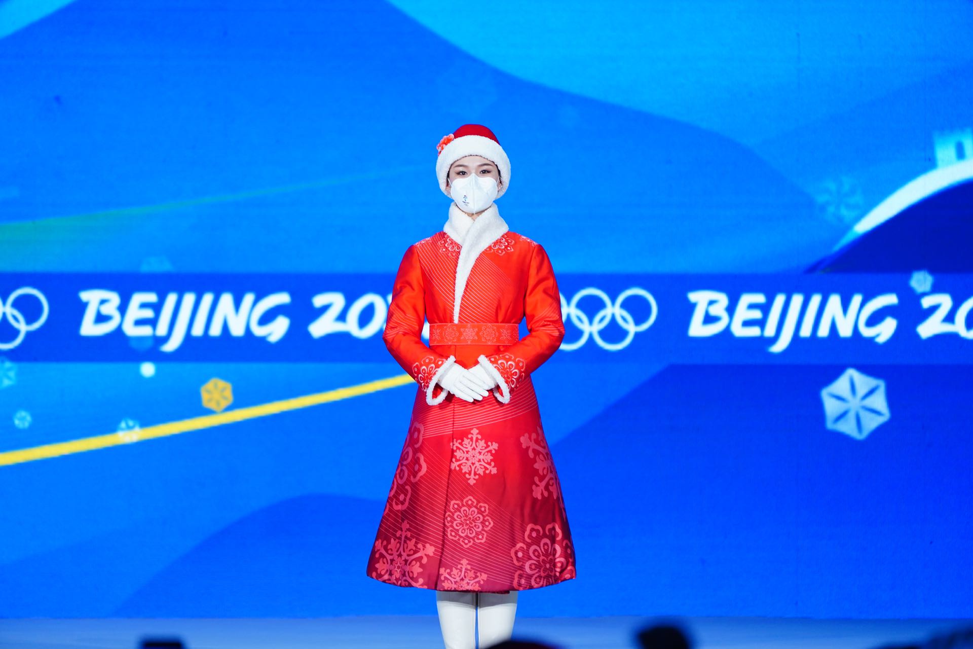 2月6日,冬奧會北京頒獎廣場和張家口頒獎廣場首次啟用,禮儀人員身著“唐花飛雪”禮服亮相,盡顯美感。