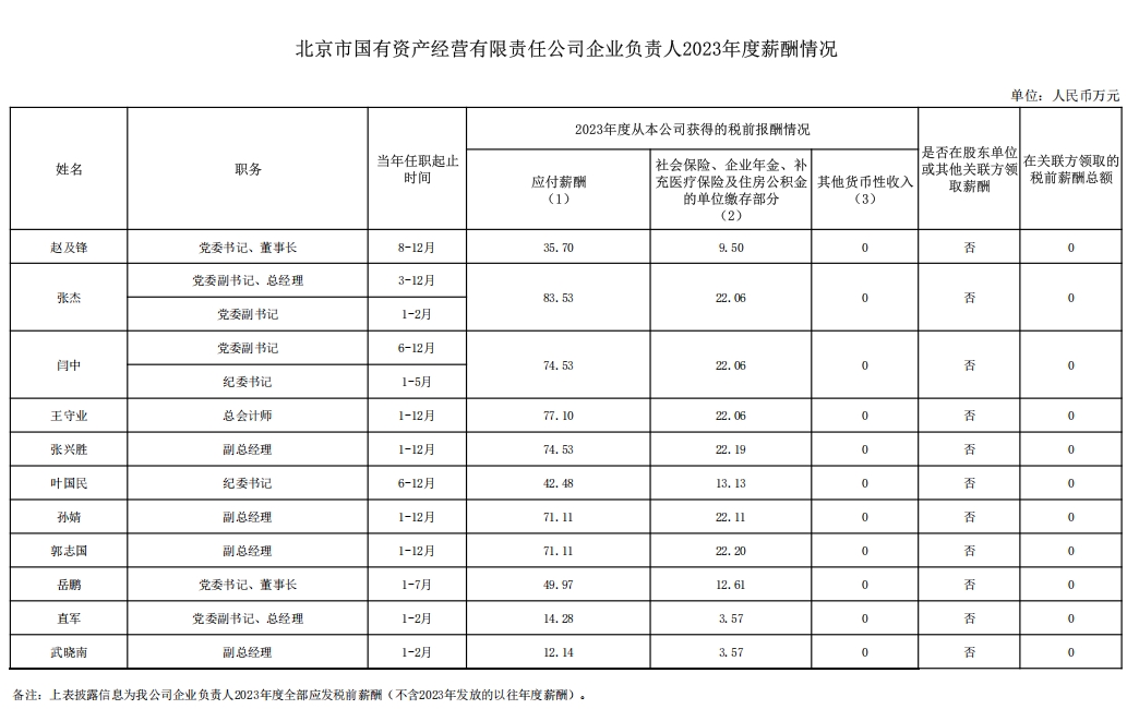 北京市國(guó)有資產(chǎn)經(jīng)營(yíng)有限責(zé)任公司企業(yè)負(fù)責(zé)人2023年度薪酬情況