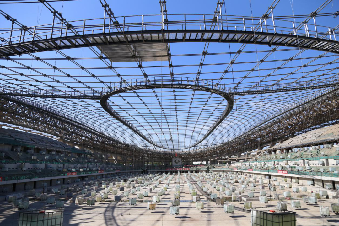 在短短的半個多月的時間里,經(jīng)歷滑移、落架、卸載等工序,橢圓形的鋼制環(huán)桁架宛如一條鋼鐵“巨龍”,以1公分之內(nèi)的誤差范圍穩(wěn)穩(wěn)地架設(shè)在主體結(jié)構(gòu)之上,工期節(jié)約了至少三個月,實(shí)現(xiàn)了基于平行施工的高效、高精度建造技術(shù)。