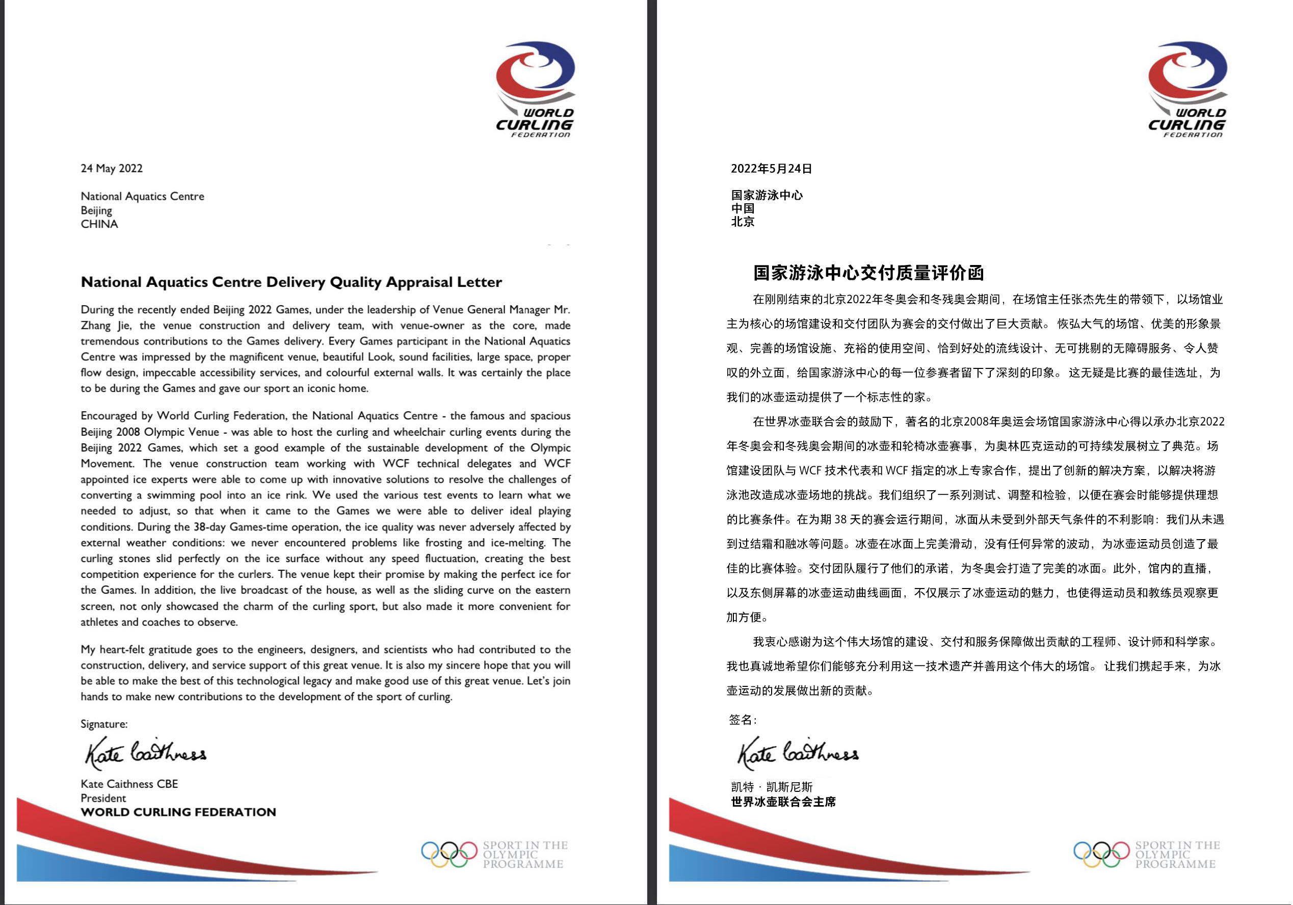 5月24日,國家游泳中心收到世界冰壺聯(lián)合會主席凱特?凱斯尼斯發(fā)來《國家游泳中心交付質(zhì)量評價函》,高度...