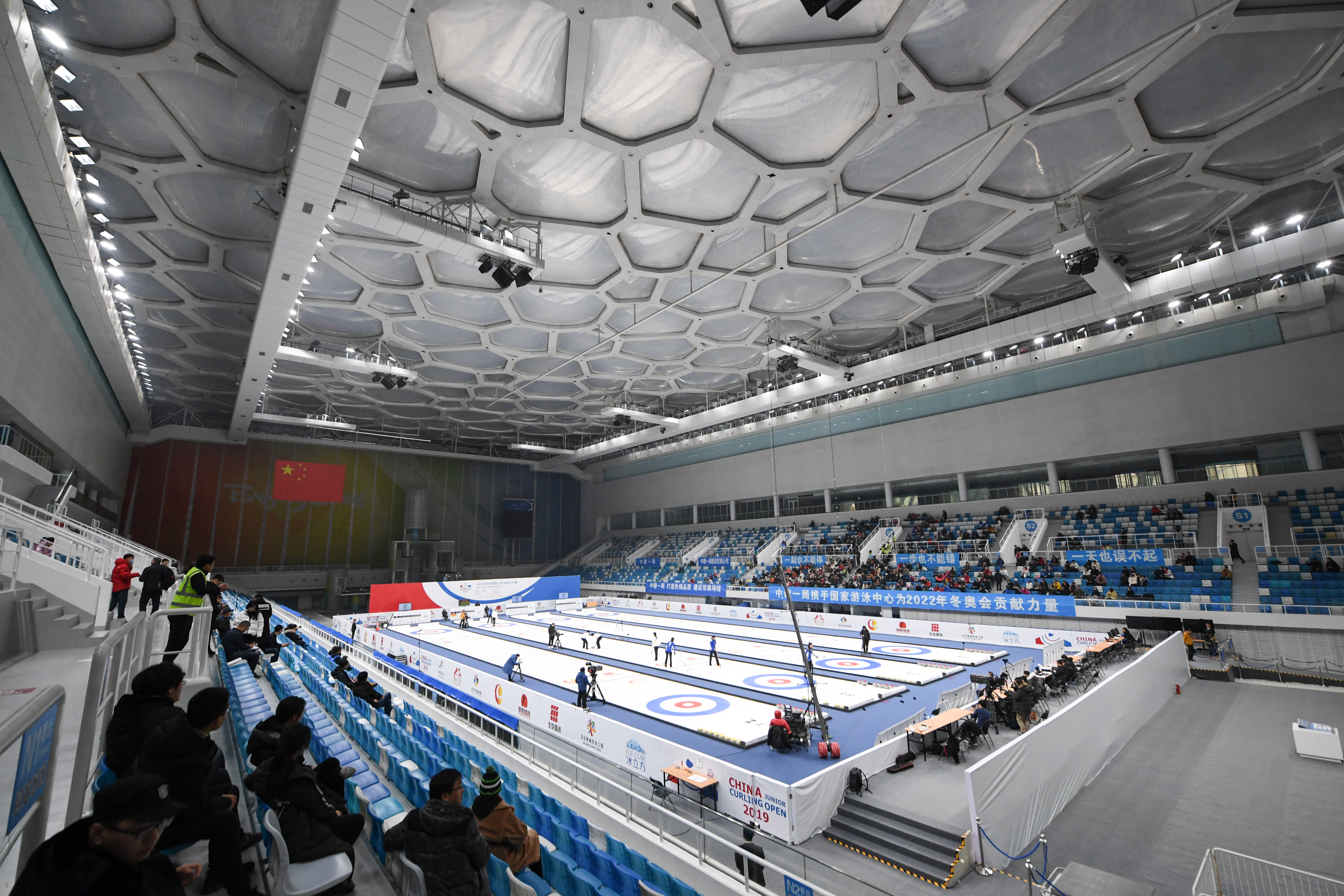2019年12月8日,觀眾在“冰立方”觀看中國(guó)青少年冰壺公開(kāi)賽女子冰壺決賽。新華社記者鞠煥宗攝