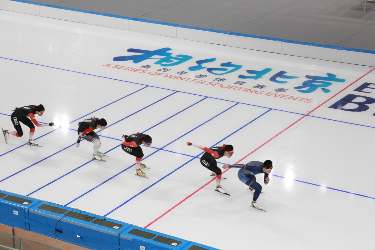 “相約北京”冰上項目測試活動速度滑冰比賽在國家速滑館“冰絲帶”開賽