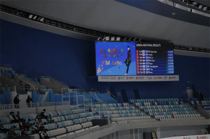 作為賽場上的氣氛擔(dān)當(dāng),比賽期間體育展示團(tuán)隊(duì)還不斷挖掘各種現(xiàn)場亮點(diǎn)。當(dāng)?shù)弥?0月9日是來自韓國的參賽選手金俊昊26歲的生日時(shí),體育展示團(tuán)隊(duì)第一時(shí)間和場館制作人溝通、制定方案,協(xié)調(diào)運(yùn)動(dòng)員服務(wù)組和志愿者團(tuán)隊(duì)確認(rèn)現(xiàn)場生日祝福呈現(xiàn)形式。比賽當(dāng)天,在金俊昊所參加的男子1000米比賽結(jié)束后,“冰絲帶”內(nèi)響起了韓語生日歌,現(xiàn)場大屏幕上也顯示出中文、韓文和英文三種語言版本的生日祝福,獻(xiàn)上了一份意外又暖心的生日驚喜。