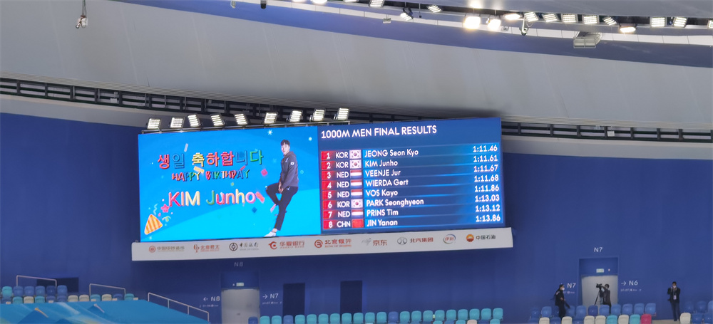 國家速滑館打造的“最快的冰”讓參賽選手屢創(chuàng)佳績。3天比賽中,共有4名運動員5次滑出個人最好成績。賽前,國家速滑館中外制冰團隊僅用10天就完成了場館制冰工作,并根據(jù)運動員反饋及時調(diào)整冰面狀態(tài),同時國家速滑館冰面的溫差控制在0.5度以內(nèi),這些都為運動員賽出好成績提供保障。在體育展示環(huán)節(jié),國家速滑館全部按照賽時運行標準呈現(xiàn),通過音樂、播報、視頻、冰面投影和特殊燈光等形式,讓運動員和現(xiàn)場人員能夠以最佳狀態(tài)融入到競賽氛圍中。此外,國家速滑館還注重提供人性化服務。10月9日比賽當天,恰逢韓國運動員金俊昊的生日。國家速滑館為他舉辦了一個“特別”的生日會,播放英文和韓語的生日歌,并在現(xiàn)場大屏幕打出暖心的中英韓三語生日祝福。金俊昊表示,這是他在賽場上過的第一個生日,是他最開心的時刻。