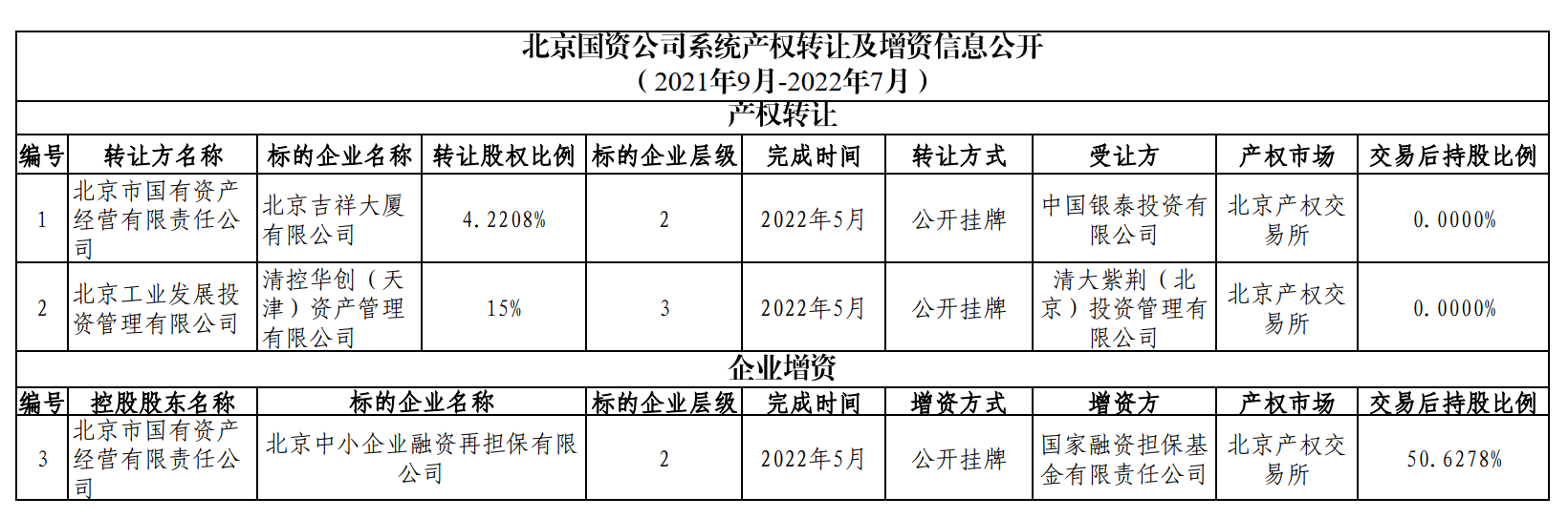 北京國資公司系統(tǒng)產(chǎn)權(quán)轉(zhuǎn)讓及增資信息公開(2021年9月-2022年7月)