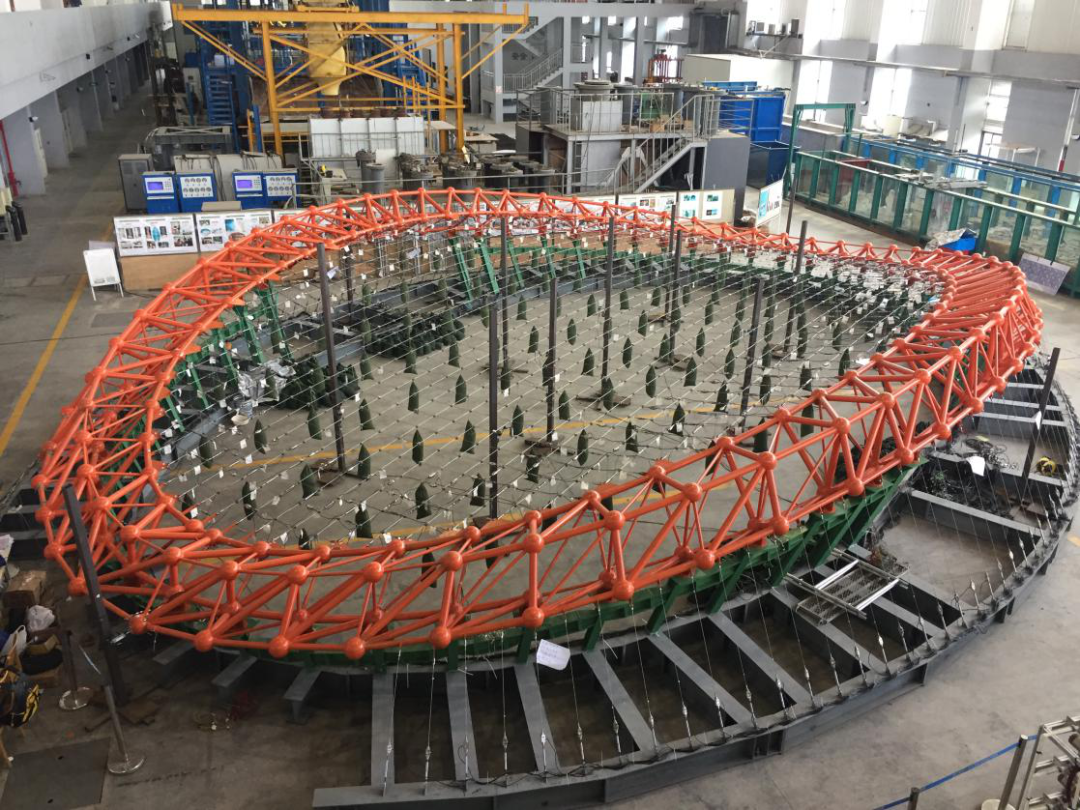 在短短的半個多月的時間里,經(jīng)歷滑移、落架、卸載等工序,橢圓形的鋼制環(huán)桁架宛如一條鋼鐵“巨龍”,以1公分之內(nèi)的誤差范圍穩(wěn)穩(wěn)地架設(shè)在主體結(jié)構(gòu)之上,工期節(jié)約了至少三個月,實現(xiàn)了基于平行施工的高效、高精度建造技術(shù)。